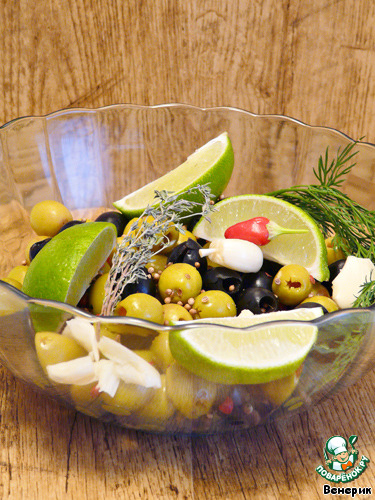 В чашку положить оливки, чеснок, зерна кориандра, лайм, разрезанный на 4 части, веточки тимьяна, укроп, острый перец, смесь перцев. Все перемешать. Соль не добавлять, так как в консервированных оливках ее достаточно.