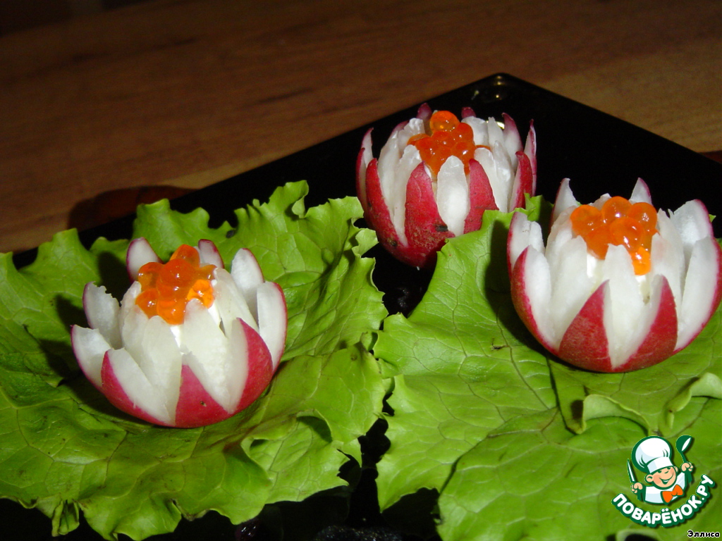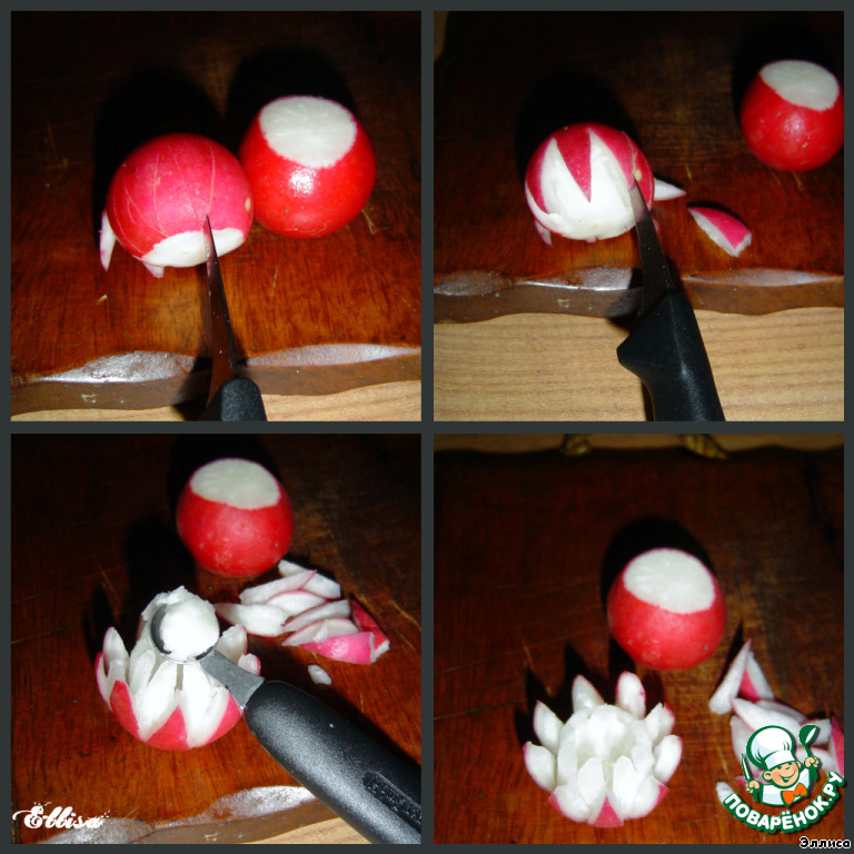 Моем редис, обрезаем верх и низ, ножом прорезаем "лепестки", а затем подрезаем и удаляем мякоть из-под "лепестков".