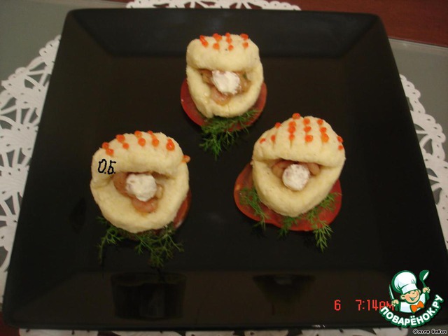 из картофельной массы делаем "ракушку", ножом делаем насечки на крышечке
