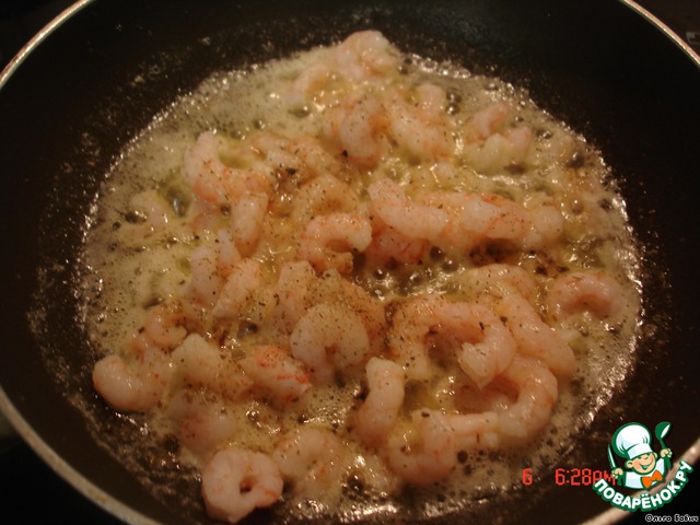 на сливочном масле жарим креветки, добавляя чеснок и специи