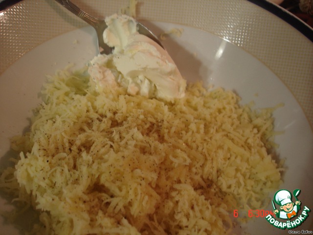 картофель трем на терке, добавляем сыр, специи, чеснок