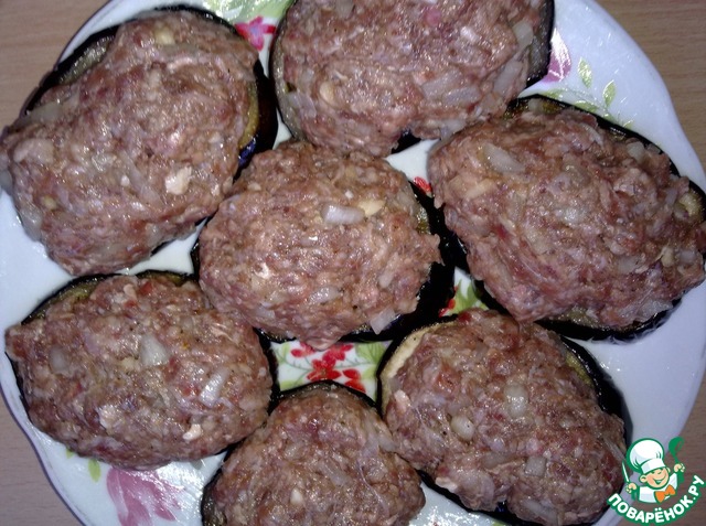В фарш добавляем измельченный лук и чеснок, солим и перчим по вкусу. Всё хорошо перемешиваем. Когда баклажаны немного остынут, наносим на них фарш.