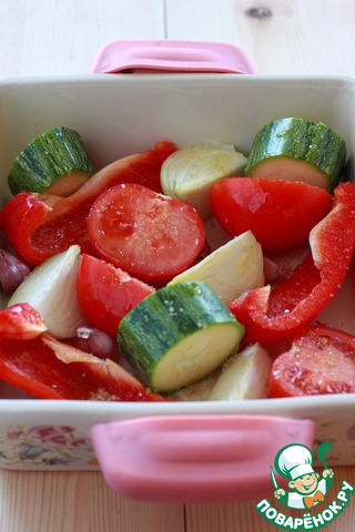 Овощи нарезать на небольшие кусочки, сложить в форму, посыпать солью и сахаром.