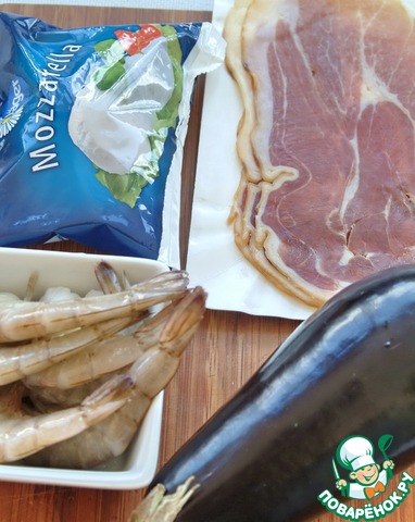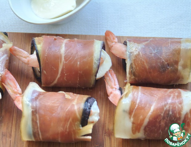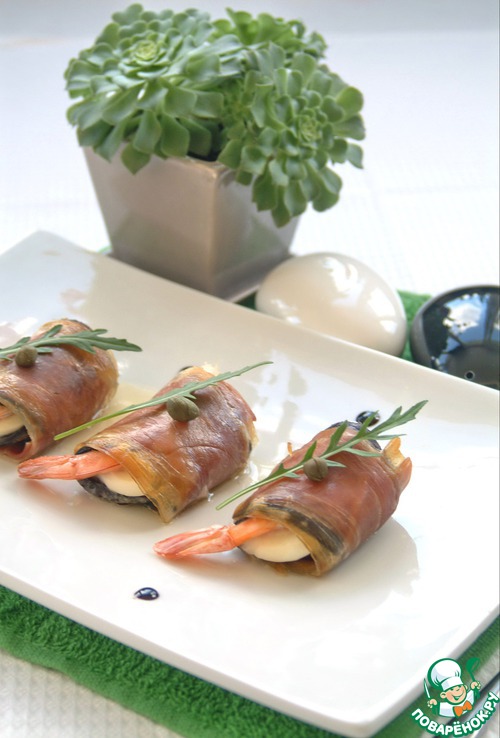 Закуска из баклажана, моцареллы и креветок в пармской ветчине