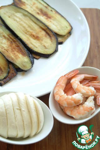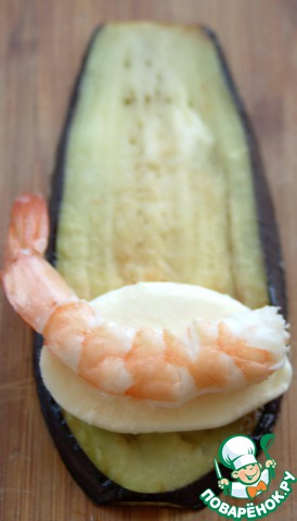 На обжаренный баклажан положить кружок моцареллы, креветку, скрутить рулетик.