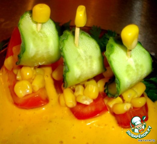 Отправляем кораблики в плавание по морковному соусу, раскрыв паруса из огурчика. Огурчик крепим при помощи зубочистки. Угощайтесь!!!