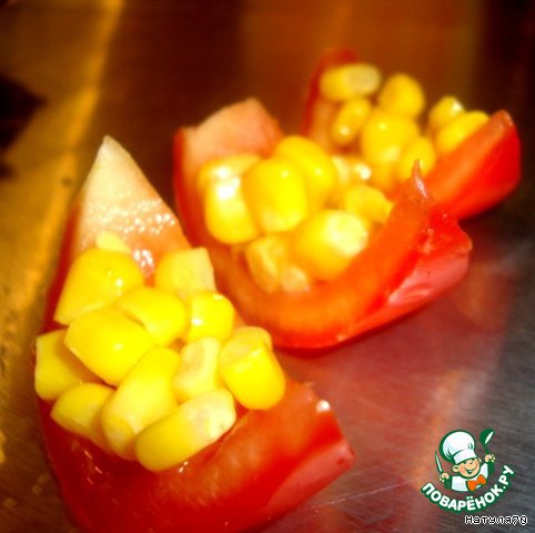 Из помидора делаем кораблики, кладем в них кукурузу.