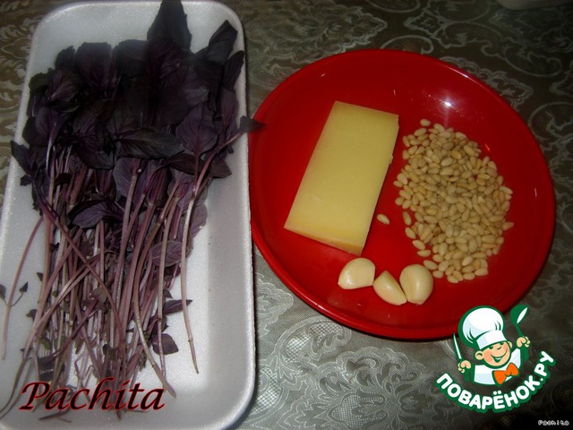 Базилик, орехи, сыр, чеснок перемолоть в блендере или пропустить через мясорубку.