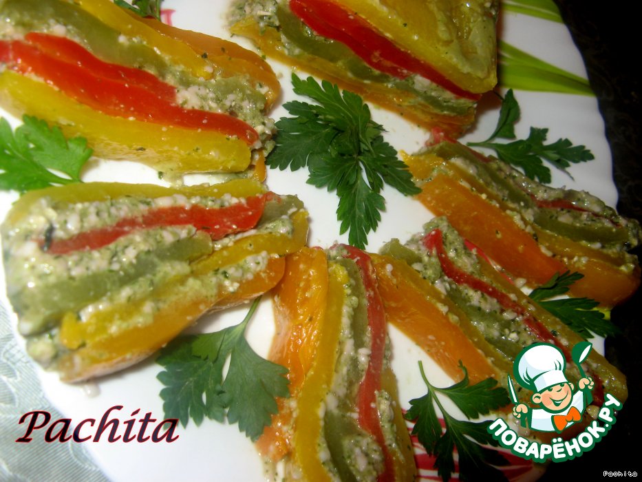 | Разноцветный сладкий перчик, с соусом из базилика, кедровых орешков, сыра... Очень сочная, вкусная закуска на любой праздник и как разнообразие в будни. |