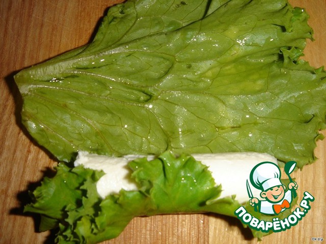 Завернуть фету в лист салата, края обрезать. То же самое сделать со вторым цилиндром.