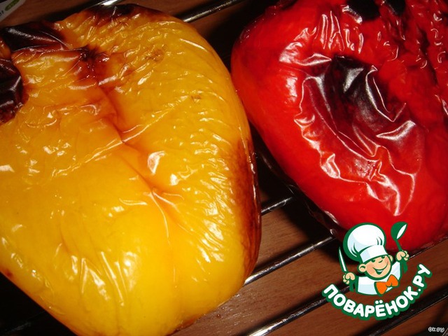 Перцы запечь в духовке, либо держа над включенной газовой конфоркой, либо под грилем (у меня в микроволновке в режиме "гриль").