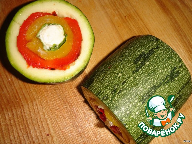 | Мне очень нравится сочетание запеченного сладкого перца и сыра фета. А если к этому великолепному сочетанию добавить еще и молоденький цукини, слегка запеченный в духовке, получается очень вкусная закуска. На конкурс "Овощной светофор". |