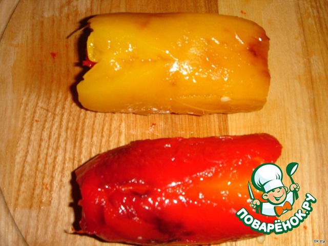 Очищенные перцы разрезать на две неравные части, одна чуть больше, другая чуть меньше. Из каждого перца должны получиться по два прямоугольника.