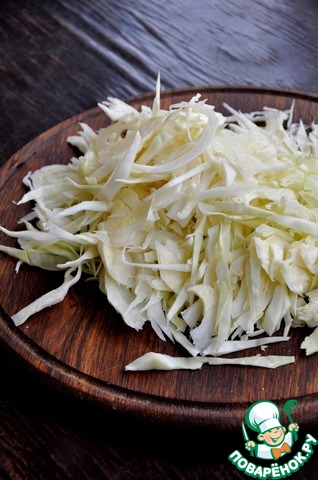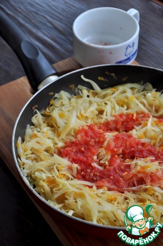 Добавить их в сковородку с капустой, влить стакан рассола. Хорошо перемешать и тушить 5 минут.