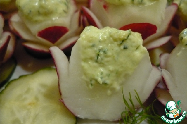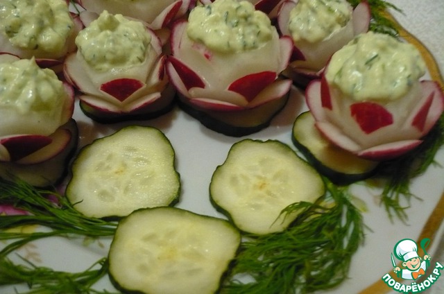 На блюдо выложить по кругу огурец. Украсить остатками укропа. На огурец положить редис и заполнить кремом.