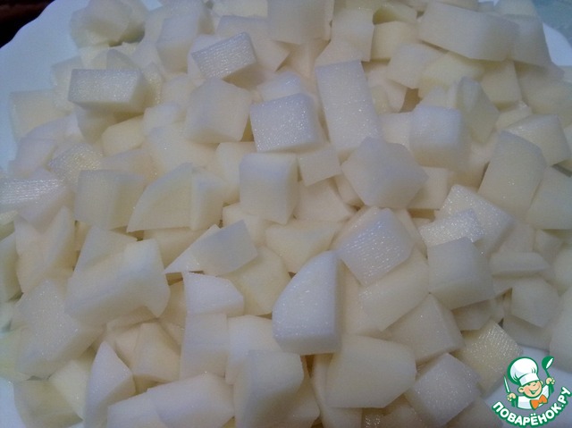 Очистить картофель, нарезать кубиками и тщательно промыть в нескольких водах, чтобы удалить крахмал.