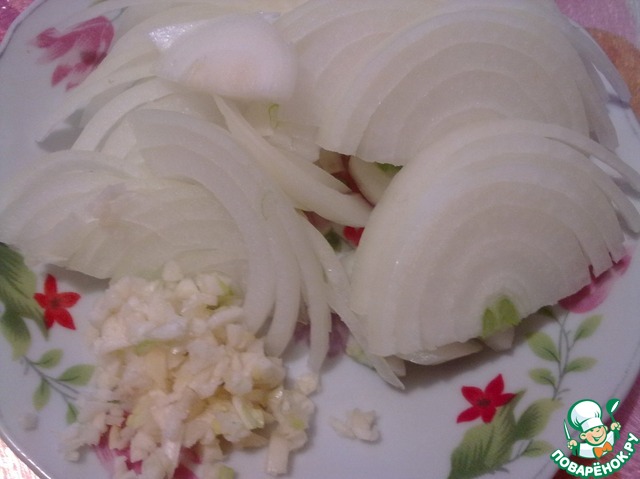 Лук нарежьте крупными полукольцами, чеснок измельчите.
