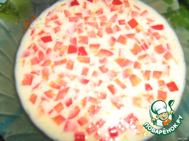 Яйцо взбиваем с молоком, добавляем нарезанный кубиками перец, соль и запекаем 2-ой корж .