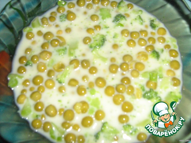 Яйцо взбиваем с молоком, добавляем зелёный горошек и соцветия брокколи, соль и запекаем 1-ый корж.