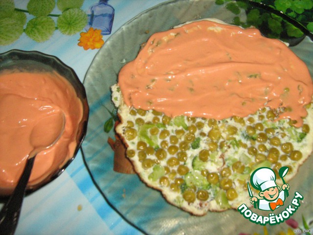 Крем для торта: майонез смешиваем с кетчупом. Промазываем коржи. А верх украшаем овощами, которые мы положили в наши коржи.