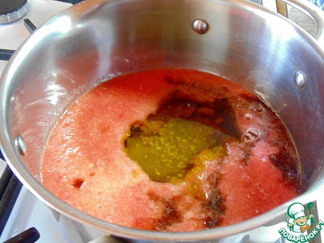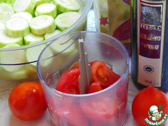В сотейнике смешать пюре из томатов, соль, сахар, оливковое масло и бальзамик.