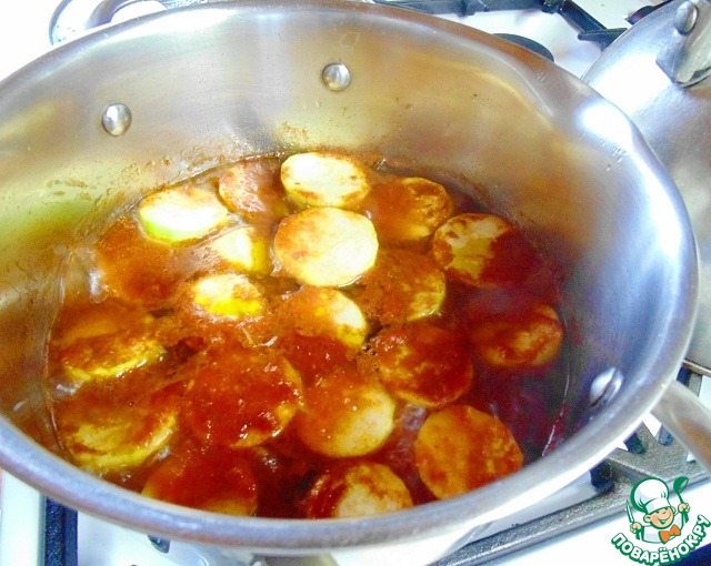 | Острая, аппетитная, летняя закуска. Меня привлекает то, что кабачки тушатся в легком томатном соусе. |