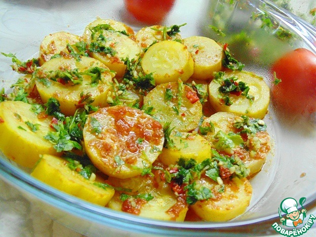 Готовые кабачки выложить рядами в глубокую посуду. Каждый ряд присыпать измельченной петрушкой с чесноком и перцем чили.