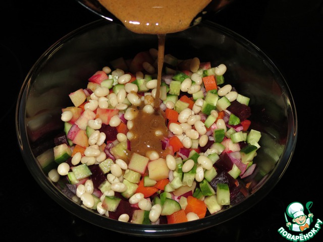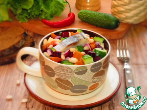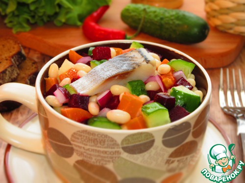 | Овощи - кладезь всех витаминов, плюс фасоль - это белок и, конечно же, селедочка, которая хорошо оттеняет сладость свеклы, фасоли и яблок. Для поста очень хороший вариант закуски или как самостоятельное блюдо на завтрак и на ужин. |
