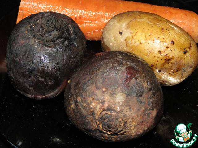 Сварить или запечь в духовке свеклу, картофель и морковь.