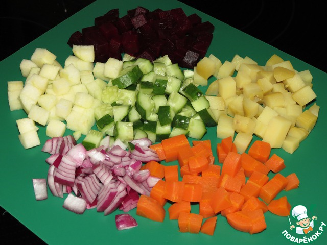 Нарезать овощи, яблоко, огурец и лук небольшими кубиками.