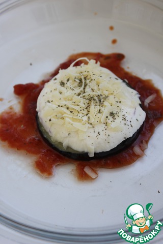 Смешайте протертые помидоры или томатную пасту с измельченными листиками (3-4 шт) базилика. Выложите 1 ст. л. полученного соуса в небольшое блюдо для запекания (каждую порцию я запекала в отдельной посуде). Сверху положите кружок баклажана, затем моцареллу, потом тертый пармезан (я еще посыпала сверху сушеным базиликом).