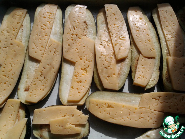 Твёрдый сыр (любой, на ваш выбор, у меня "Айвенго") порежьте на пластиночки и выложите поверх баклажан.