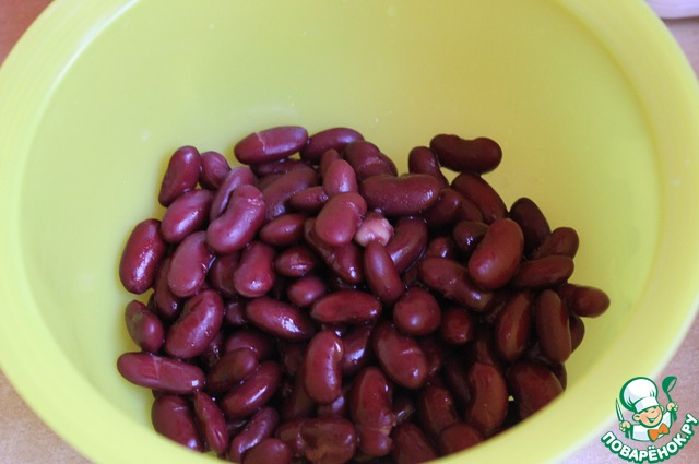 Для начинки я взяла фасоль фирмы Мистраль, темную. Я ее замочила на ночь, а утром отварила.
