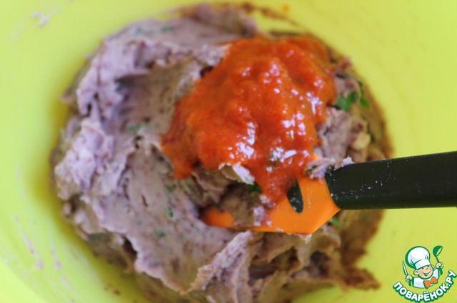 В кашицу из фасоли добавляем чеснок, томатную пасту и резаную (мелко) петрушку.