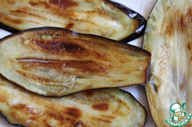 Теперь обжариваем наш баклажан с двух сторон на масле, складываем на салфетку и намазываем нашей фасолевой пастой, сразу сворачиваем в трубочку и выкладываем на тарелку. Лучше баклажан почистить, я делала первый не очищенный, а следущий уже почистила, и было удобнее скручивать его тубочкой.