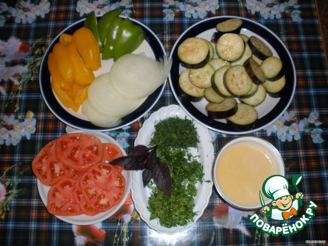 Режем овощи.Баклажаны солим и выдерживаем до мягкости,помидоры обдаем кипятком, снимаем кожицу и режем кружками, лук режем тонкими кольцами, перец нарезаем четвертинками, можно и мельче, зелень мелко шинкуем, взбиваем 1 или 2 яйца, в зависимости от размера...
