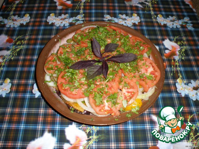 Последним слоем выкладываем помидоры, присыпаем их зеленью, можно слегка посолить.Далее все блюдо поливаем оставшимся соусом.Готовое блюдо можно убрать на 30 минут в холодильник, но можно есть и теплым, вкус не хуже.