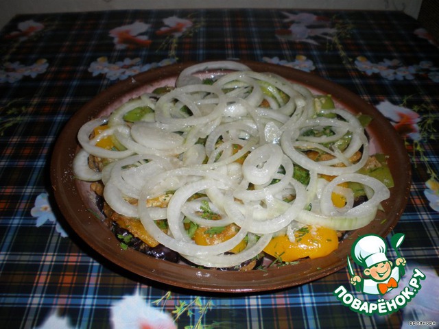 Укладываем лук, предварительно замариновав его в соусе, сделанном: из тертого чеснока, уксуса, воды, соли и масла,на котором жарились овощи, слив его через ситечко(соус готовится на ваш вкус. Он понадобится вам ещё раз, в конце приготовления)
