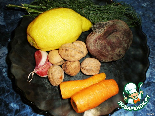 Берём вареную свёклу,лимон,орехи,укроп и морковь.