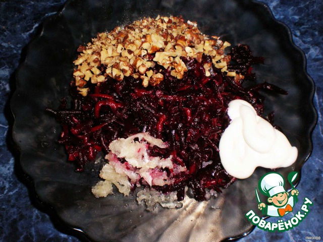 Свёклу очищаем и натираем на крупной тёрке.Чеснок тоже очищаем и трём на мелкой тёрке.Грецкие орехи измельчаем.Солим,добавляем майонез и перемешиваем.