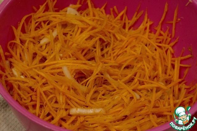 Взять большую салатницу. Соединить морковь с луком и чесноком, добавить специи и лимонный сок, тщательно перемешать. Салатницу накрыть плоской тарелкой, сверху поставить "груз" (я ставила кастрюлю подходящего диаметра с водой). Поставить в холодильник минимум на 12 часов.