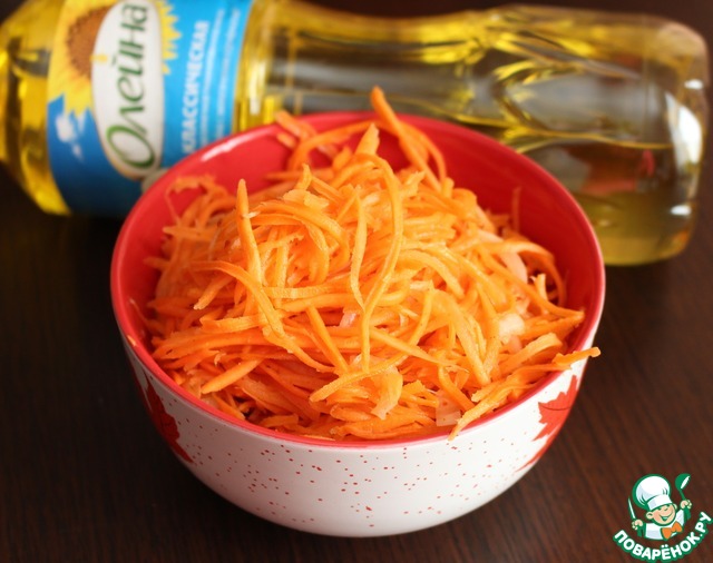 Готовую морковь заправить подсолнечным маслом, подать к столу. Для хранения переложить морковку вместе с соком в банку, поставить в холодильник.
