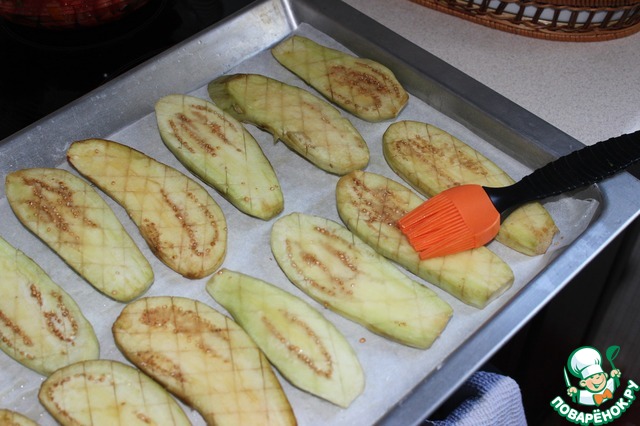 Противень застелить бумагой для выпечки, выложить баклажаны. Каждую пластинку промазать оливковым маслом.