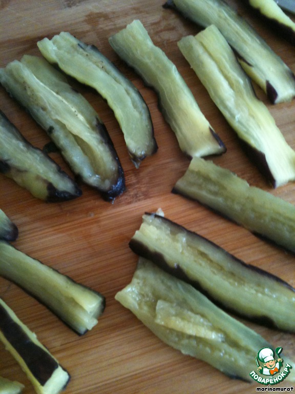 Баклажаны станут очень мягкими. Разрезаем каждый на половинки, а потом каждую половинку на 4 полосочки. Посолите их еще раз, если необходимо.