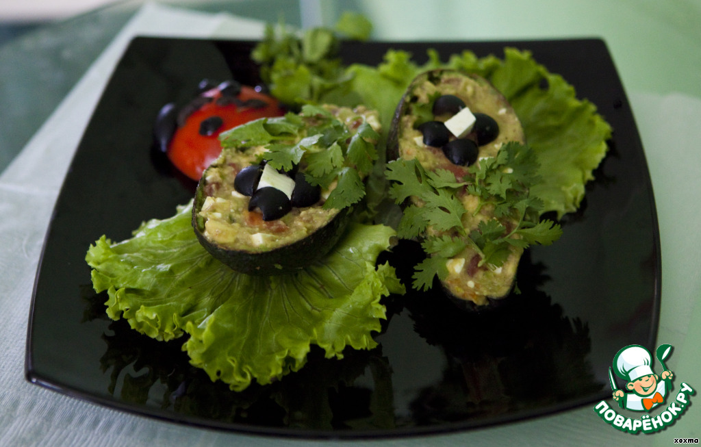 Теперь я наполню пустые половинки авокадо салатом, украшу их оливками и листиками петрушки, которая, кстати, избавит Вас от запаха чеснока!
