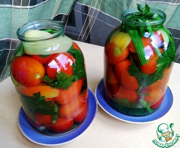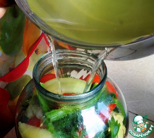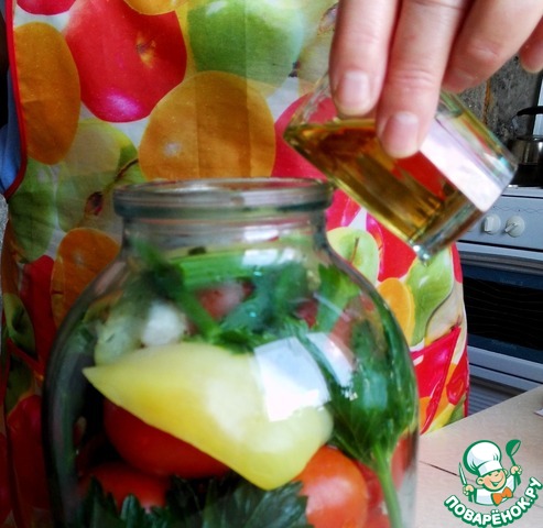 Сложить помидоры и овощи в банку, залить крутым кипятком.