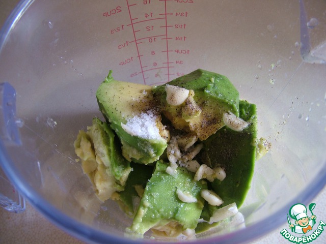 Очистите и нарежьте авокадо, добавьте зубчик чеснока, соль и перец по вкусу.