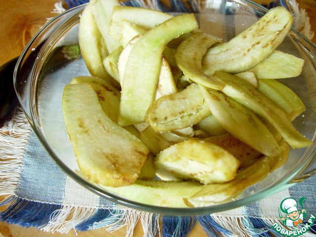 Баклажаны очистить, порезать вдоль, пересыпать солью и оставить на 20-30 минут, пока не выпустят сок. После промыть и слегка отжать