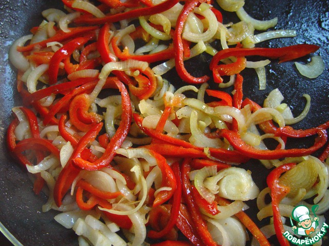 Тушеные лук и перец смешать с зеленью и чесноком, добавить зиру, посолить