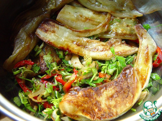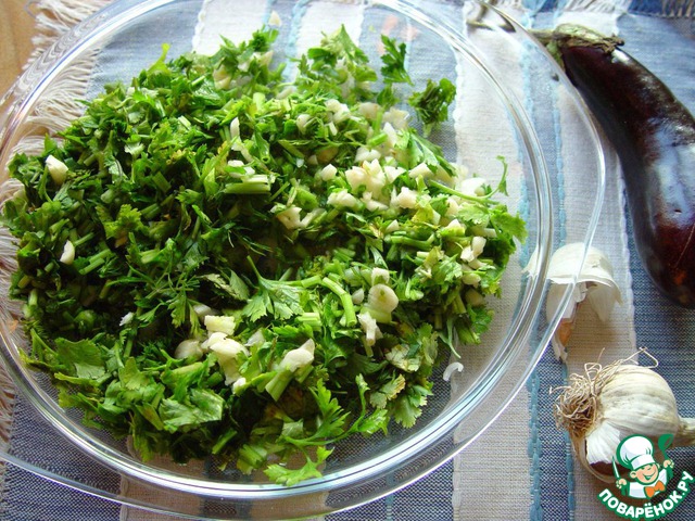 Слоями - баклажаны-зелень-бак лажаны - выложить все в подходящую посуду. У меня получилось четыре слоя баклажанов и три зелени.